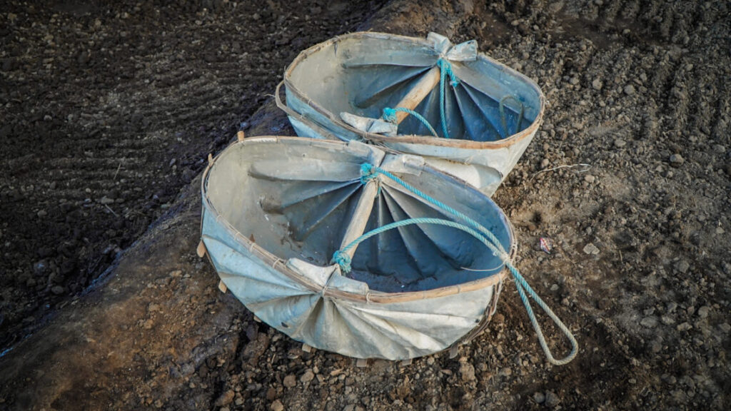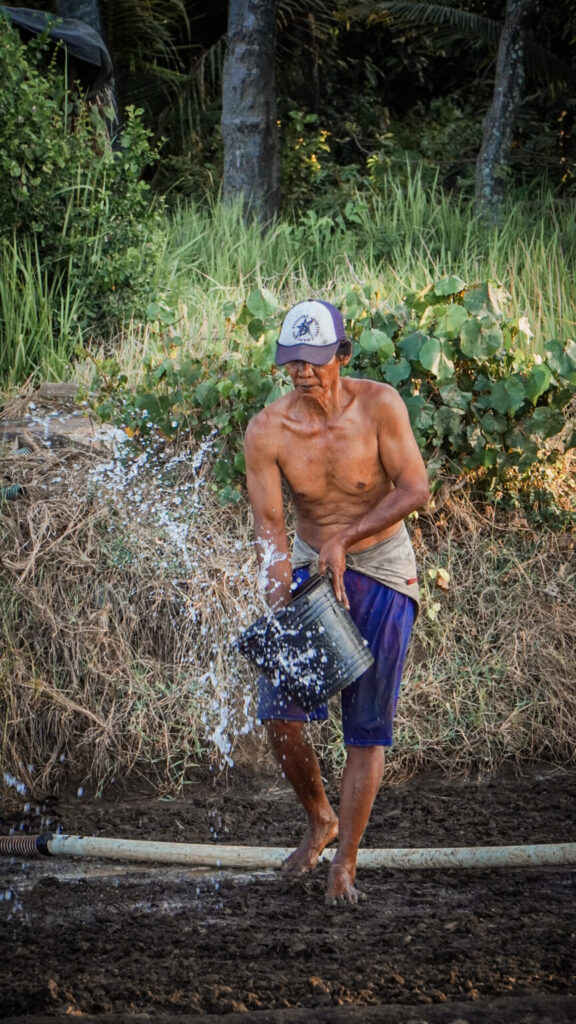 Di ladang sebelah, bersama istrinya, seorang lelaki paruh baya masih sibuk mengalirkan air laut ke ladang garamnya. Sebelum ada diesel pompa air, petani garam Les dulu menggunakan alat penimba bernama sena. Dan itu cukup melelahkan. Petani garam harus bolak-balik untuk mengambil air laut. “Saya masih menyimpan alatnya,” Kirana berkata sembari mengambil sena. Tak selang lama ia keluar dari gubuk rumbianya dengan sepasang sena yang dipikul. Saya mengabadikan momen tersebut