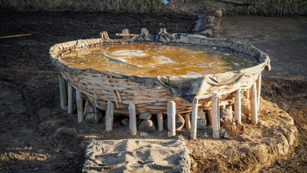Selanjutnya, tanah itu dimasukkan ke dalam tinjungan, alat penyaringan tradisional yang dilapisi daun lontar, daun kelapa, kerikil ukuran kecil dan pasir. Dari tinjungan ini kemudian keluar air nyah (biang garam) yang ditampung di dalam brombong atau bak yang terletak di bawah tinjungan. Nyah inilah yang disemai di palung-palung milik petani garam di Les.